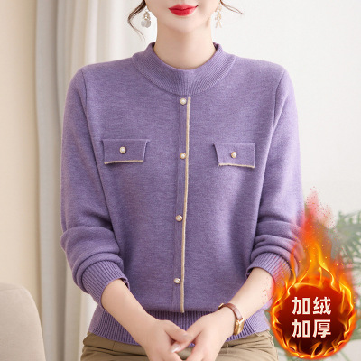 新款中领妈妈冬装上衣时尚简约假口袋中老年人保暖打底衫加绒衣服