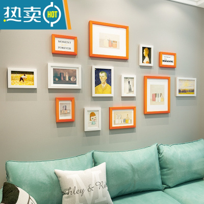 敬平现代简约照片墙相框挂墙免打孔创意装饰卧室客厅组合框加洗照片框 13框 白色+橙黄色 洗照片+(安装图纸+无痕钉等配件