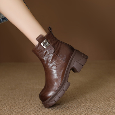 头层牛皮秋冬新款短靴女复古圆头粗跟加绒保暖马丁靴女烟筒靴