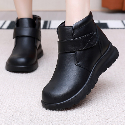 冬加厚绒毛中老年妈妈短靴宽松圆头棉鞋真皮软底软面奶奶皮棉鞋