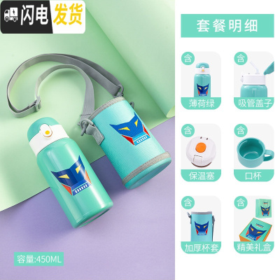 三维工匠儿童保温杯带吸管防摔两用水杯女童男幼儿园宝宝小学生不锈钢水壶 薄荷绿450(级316+吸嘴+杯刷+吸管刷)
