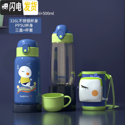 三维工匠卡通可爱儿童保温杯带吸管两用宝宝女童小学生水壶幼儿园防漏水杯 浅蓝/500K0047萌星保温杯