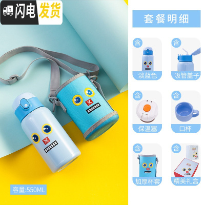 三维工匠儿童保温杯带吸管防摔两用水杯女童男幼儿园宝宝小学生不锈钢水壶 淡蓝色550(级316+吸嘴+杯刷+吸管刷)