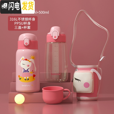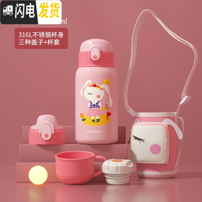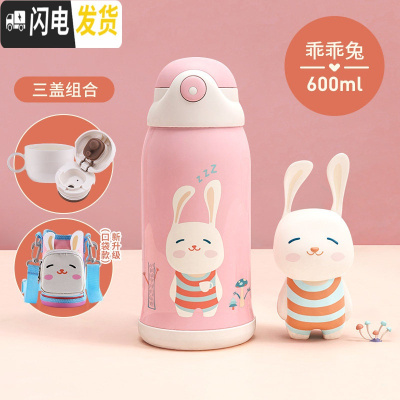 三维工匠儿童保温杯带吸管两用水壶小学生男便携防摔幼儿园宝宝女童水杯子 [保温杯+口袋杯套]乖乖兔600◆一杯三盖