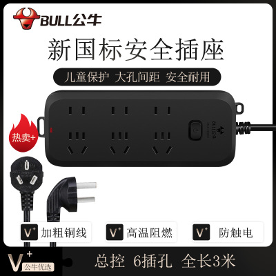 公牛(BULL)新国标插座/插线板/插排/排插/接线板/拖线板 黑色质感 6位总控全长3米 GN-B8330H