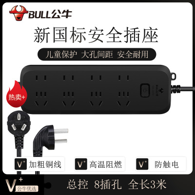 公牛(BULL)新国标插座/插线板/插排/排插/接线板/拖线板 黑色质感 8位总控全长3米 GN-B8440H