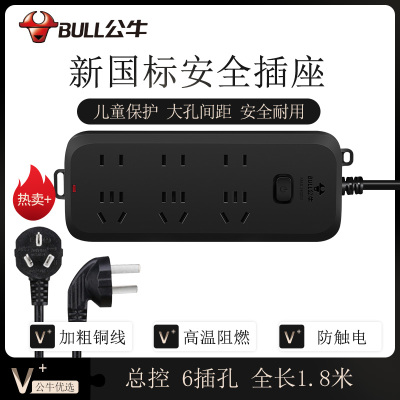 公牛(BULL)新国标插座/插线板/插排/排插/接线板/拖线板 黑色质感 6位总控全长1.8米 GN-B8330H