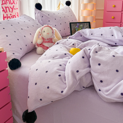 ins风紫色波点牛奶绒床上四件套冬季加厚毛绒床品被套床单三件套
