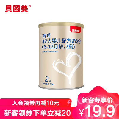 贝因美(Beingmate)菁爱(原金装爱+)较大婴儿配方奶粉 2段(6-12个月适用) 200克罐装