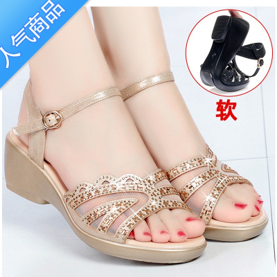 SUNTEK坡跟凉鞋女2023年新款夏季中跟时装厚底舒适软底中年妈妈款大码