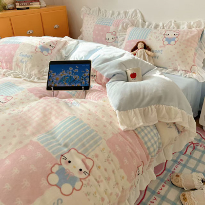 可爱花边款A类冬季牛奶绒四件套卡通少女加绒加厚防静电被套床单