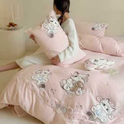 少女心保暖牛奶绒四件套可爱猫咪刺绣冬季加厚防静电被套床品套件