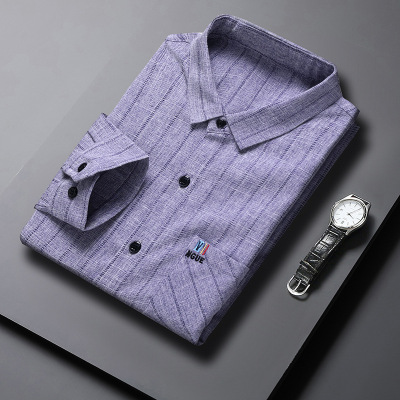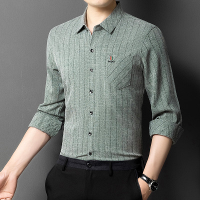 男士长袖衬衫春秋季新款长袖翻领棉麻衬衫男中老年爸爸装条纹衬衣