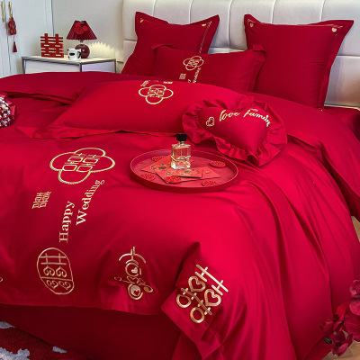 结婚四件套全棉纯棉婚庆天丝刺绣被套水洗真丝婚床上用品