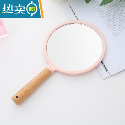 敬平榉木双面手柄镜美容院便携纹绣专用木制复古化妆镜圆形手拿镜子女 单面榉木圆粉色便携式用镜