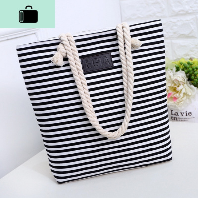韩国版简约麻绳帆布包单肩手提购物袋大文艺女包学生书标NEW LAKE 黑色横条纹皮标黑色 默认女手包