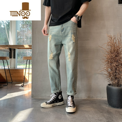 YANXU水洗复古牛仔裤男款潮牌直筒修身休闲九分裤春季炸街痞帅破洞裤子