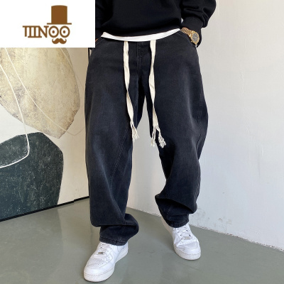 YANXU春季美式休闲痞帅黑色直筒牛仔裤男宽松百搭高街抽绳阔腿长裤子潮
