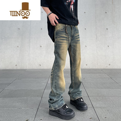 YANXU美式高街vibe做旧黄泥染水洗牛仔裤男潮ins直筒微喇cleanfit裤子