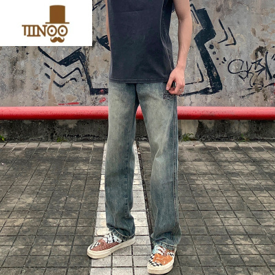 YANXUDAL复古蓝直筒牛仔裤男2023年新款水洗做旧磨白美式高街休闲长裤