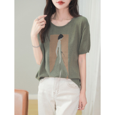 复古美人印花圆领气质泡泡袖宽松显瘦通勤全棉线女士针织短袖T恤