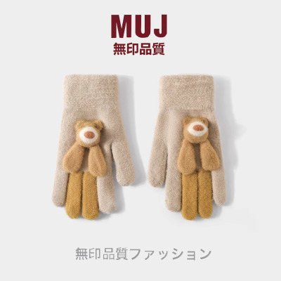 可爱小熊毛绒手套女秋冬季骑车防寒五指学生全指加绒加厚针织