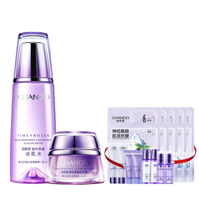 自然堂(CHANDO)凝时鲜颜水霜护肤套装(冰肌水160ml+小紫瓶熬夜霜50ml+赠品)保湿修护化妆品