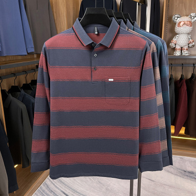 中年翻领色织条纹polo衫男秋季新款休闲假口袋男士打底衫