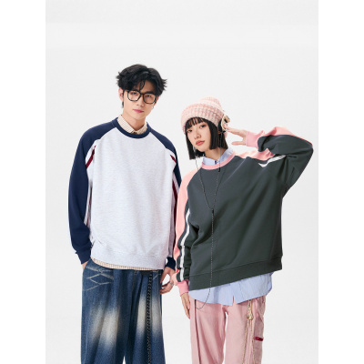 秋季新款美式卫衣男女同款潮牌拼接撞色插肩袖宽松圆领上衣情侣装