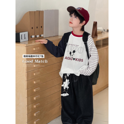 童酷男童秋季新款洋气米奇印花宝宝打底衫插肩袖拼色儿童T恤