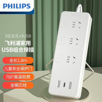 飞利浦(PHILIPS)新国标USB插座3位总控1.8米插排/插线板/排插/接线板/拖线板/3USB接口多功能插板