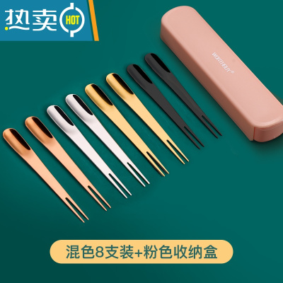 敬平创意304不锈钢水果叉甜品勺水果叉子ins北欧风两用叉勺月饼小叉勺 混色8支装+粉色收纳盒牙签