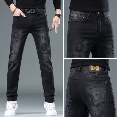 欧货印花牛仔裤男秋冬新款潮牌潮流修身小直筒休闲牛仔长裤子