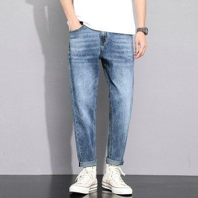 潮牌通勤风牛仔裤 男款九分锥形哈伦 春季水洗蓝休闲长裤男装
