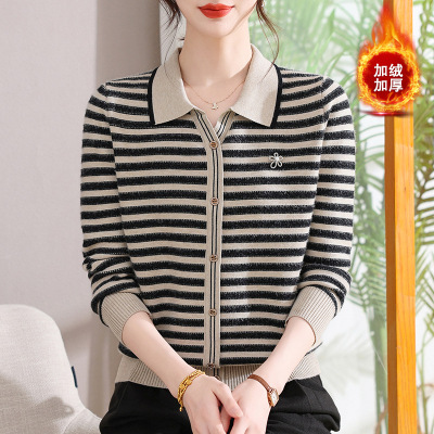 条纹妈妈装加绒保暖针织衫女冬装中老年人毛线上衣小翻领套头