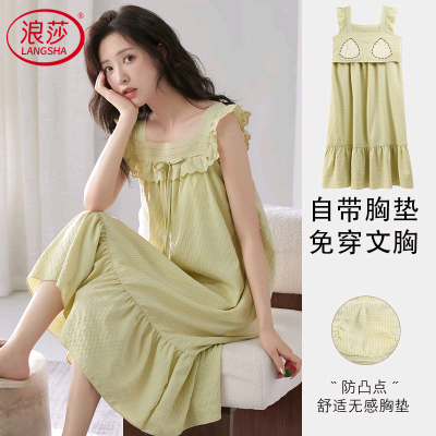 浪莎2025新款带胸垫睡裙女夏云朵棉睡衣吊带韩范可外穿休闲家居服