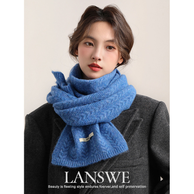 浪莎优品高级感麻花羊毛混纺蓝色围巾女冬季保暖秋冬韩版围脖礼物