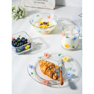 亿嘉耐热玻璃碗盘小清新餐具套装家用碗碟组合沙拉碗餐具菜盘[小清新花卉杯]