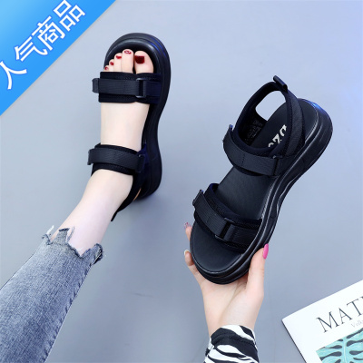 SUNTEK平底运动凉鞋女2023夏新款休闲罗马鞋魔术贴软底大码41黑色沙滩鞋