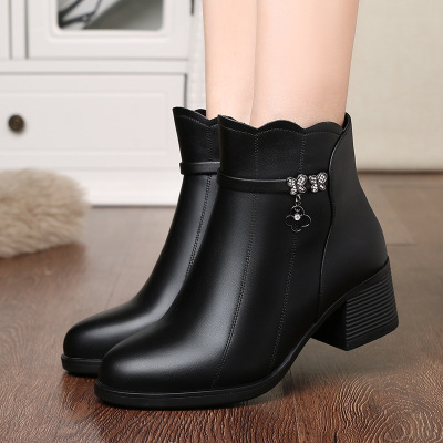 秋冬中跟妈妈棉鞋新款加厚加绒软底女皮靴中老年时尚低筒棉靴