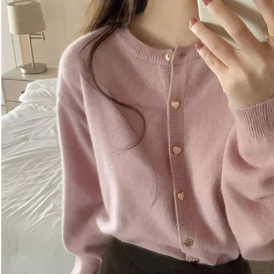 粉色针织开衫女韩版秋冬新款优雅气质软糯毛衣宽松短款圆领薄外套