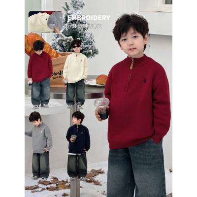 童酷男童冬季新款韩版刺绣宝宝针织衫纯色拉链领宽松儿童毛衣