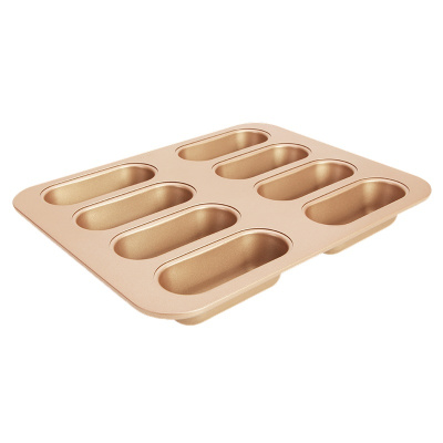 学厨 8连杯长条型蛋糕面包模具 32.5*25.8*4cm 香槟金色迷你不粘热狗汉堡烤盘 家用烤箱用具 WK9145