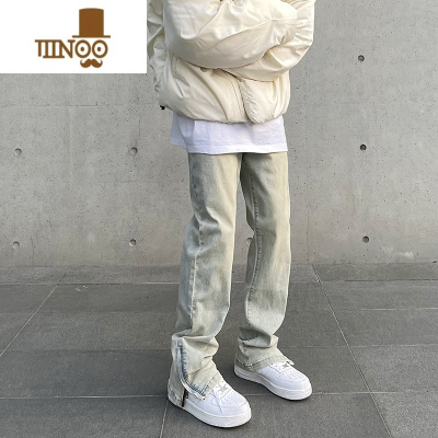 YANXU美式高街vibe复古水洗做旧黄泥染拉链开叉牛仔裤男直筒微喇长裤子