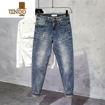 YANXU牛仔裤男新款漆点泼墨修身小脚复古蓝猫须破洞潮牌痞帅长裤
