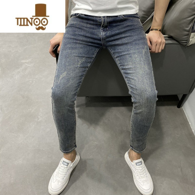 YANXU一款经典百搭的复古做旧蓝灰色小脚九分牛仔长裤潮男高街弹力裤子