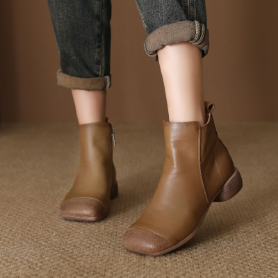 圆头粗跟短靴女25冬季新款牛皮短靴中跟侧拉链靴复古百搭短筒棉