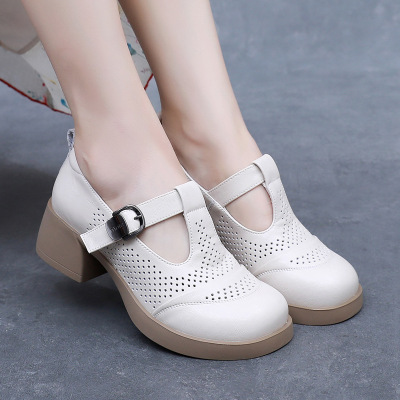 25春夏新款妈妈鞋英伦复古风粗跟洞洞鞋中跟丁字扣厚底一字带休闲