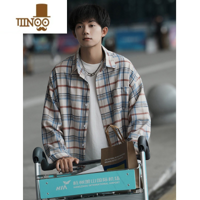 YANXU日系复古格子衬衫男士潮牌百搭休闲长袖痞帅宽松衬衣服外套