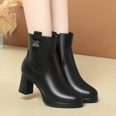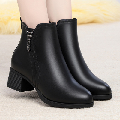 真皮妈妈鞋子加绒短靴女靴子皮鞋新款秋冬季粗跟高跟鞋马丁靴